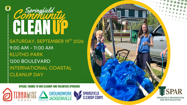 The Springfield Cleanup Corps, a program of Springfield Preservation and Revitalization in partnership with the City of Jacksonville, hosts 12-15 Community Cleanup events each year to beautify our neighborhood. One of the best ways to support our work is to volunteer at a Community Cleanup. We will pick up trash along sidewalks and city right of ways in a designated portion of the Springfield Historic District. We provide gloves, trash bags, and garbage pickers for your convenience.
