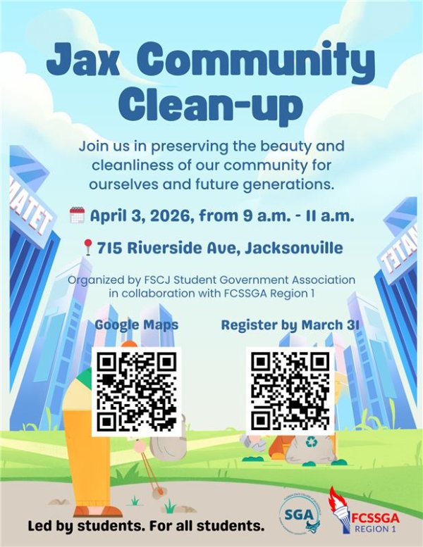 In collaboration with FCSSGA Region 1 Community Clean-up Service Project, FSCJ Student Government Association (SGA) has created this great opportunity to give back, build connections, and make a lasting impact on our city.